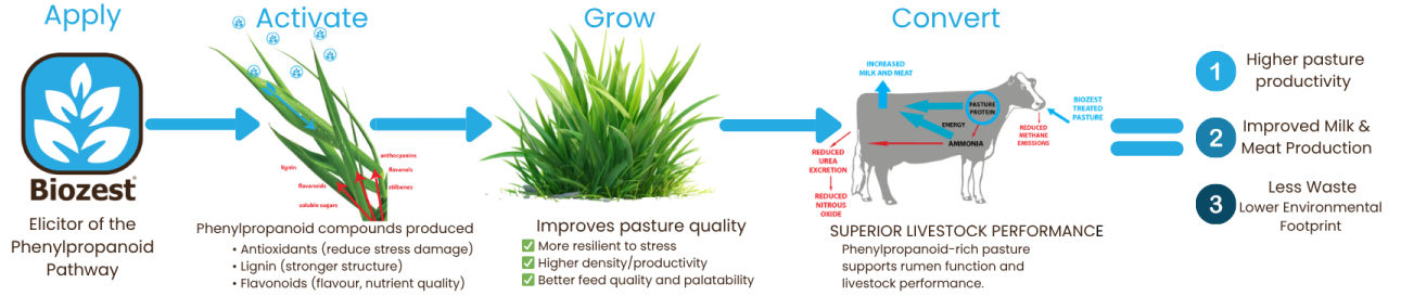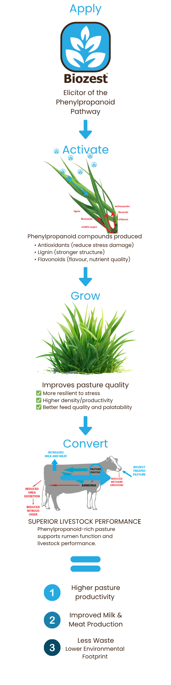 A New Zealand–developed phenylpropanoid elicitor proven on Kiwi farms to increase pasture growth, animal performance, and efficiency.
