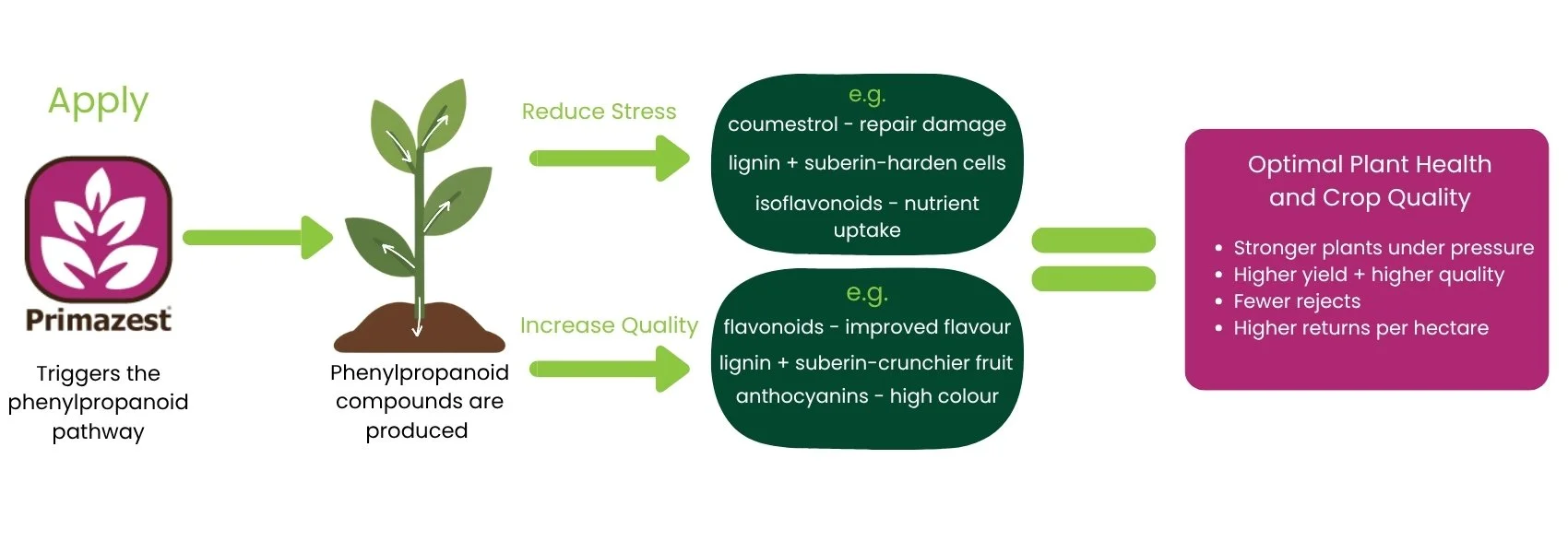 Primazest doesn’t feed plants — it activates the phenylpropanoid pathway — the system that drives plant defence, growth and crop quality.